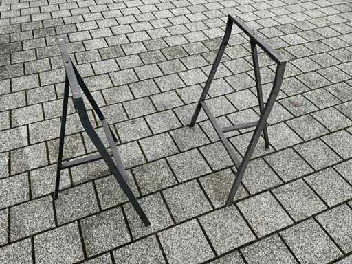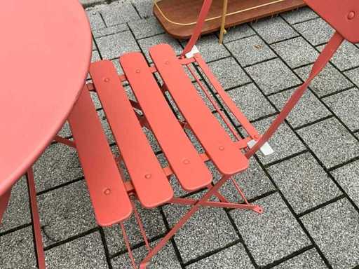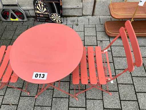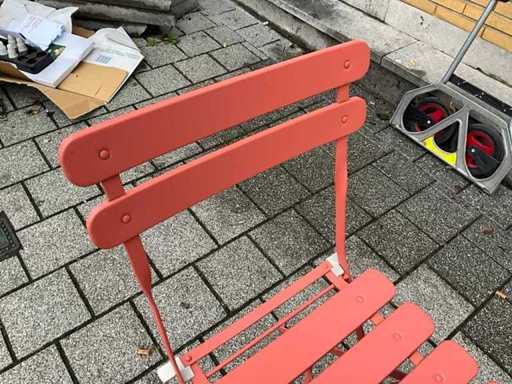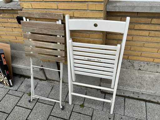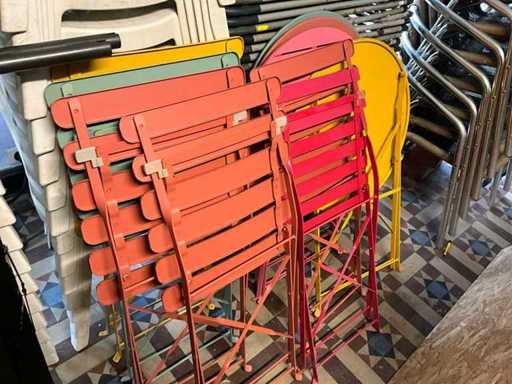 7 metal chairs, 4 metal tables dia 60cm in various colors + 2 various chairs.