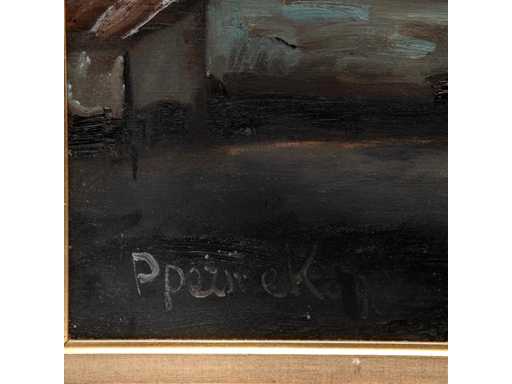 Impressive, large-scale winter landscape with a low village scene under a dramatic sky, executed in powerful brushstrokes and a warm-contrasting colour palette. The work showcases Paul Permeke's signature expressive vision of the Flemish landscape, rugged, charged and poetic – framed