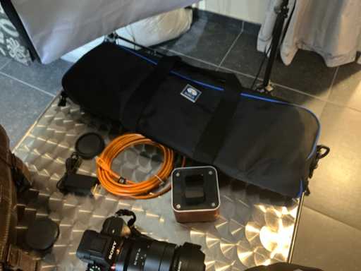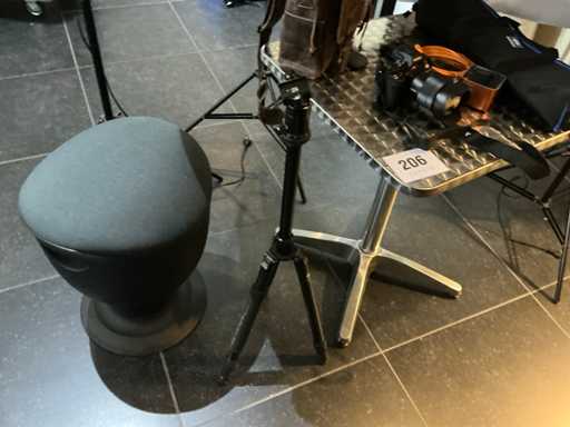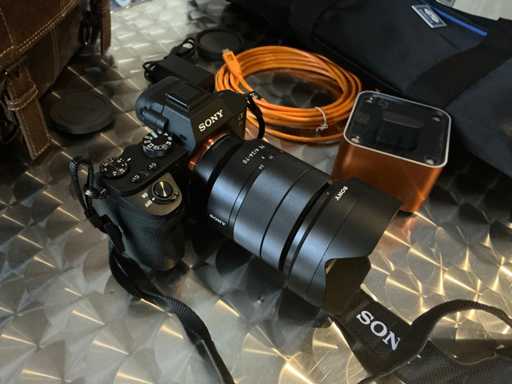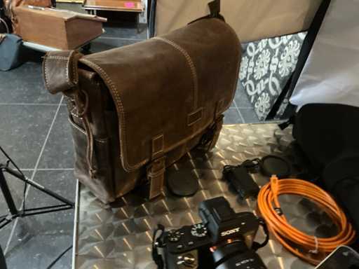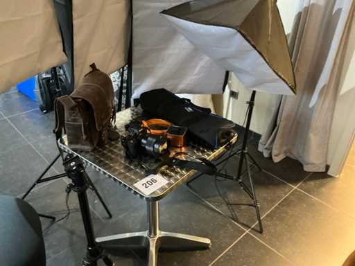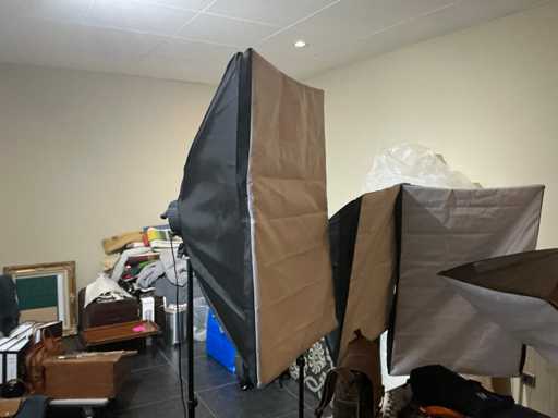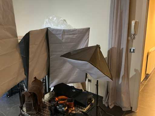 Consisting of: Sony photo camera with Zeiss lens; 1 camera tripod; 4 various softbox studio lights; 1 metal table; 1 design stool and 2 various carrying bags