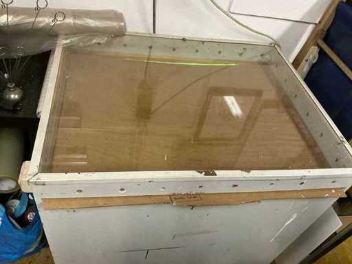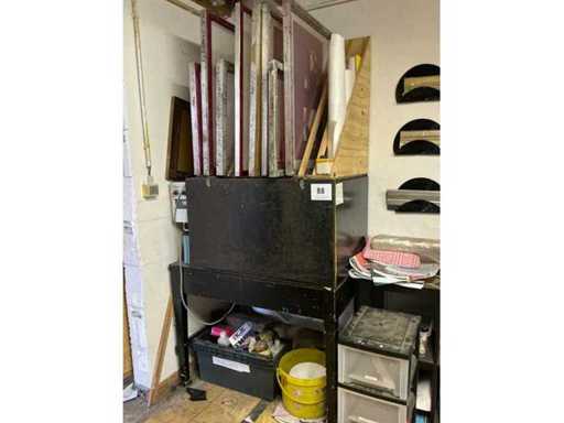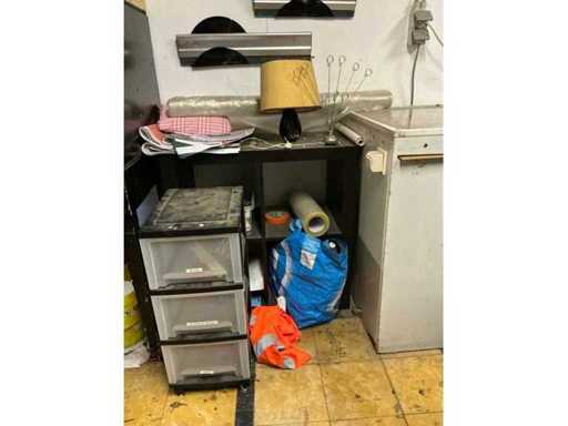 Size approximately 105 x 68 x 140 cm, light box with dimensions approximately 70 x 89 x 90 cm, table size approximately 187 x 135 x 90 cm, complete with content including various screen prints, ditto material, addressed paint, meters, scissors, clothing, 3 various hair dryers, batch of goodie bags, and so on