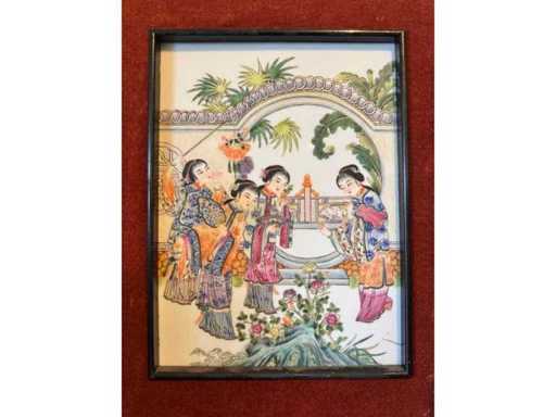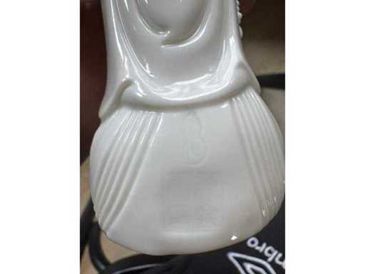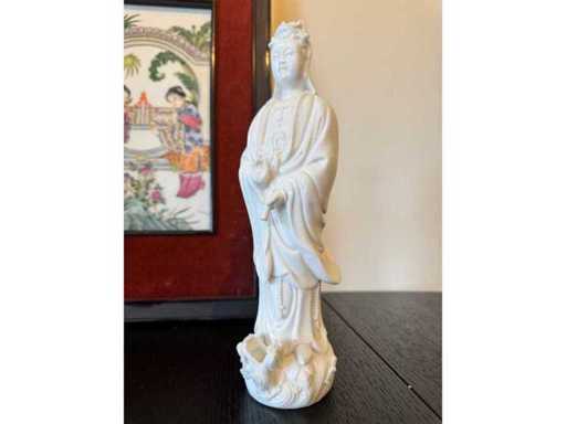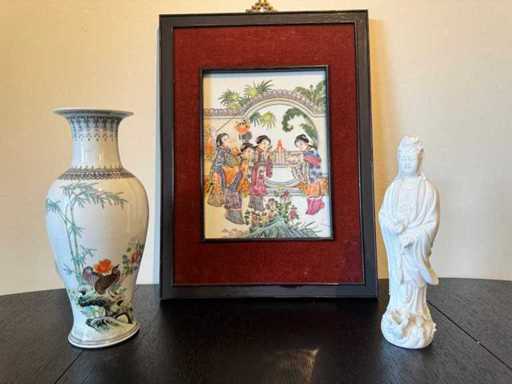Collection of Chinese items. 3 items. Porcelain tablet framed in suede frame, Dehua blanc de chine figurine of Guanyin stamped, Jingdezhen vase with pheasants stamped.