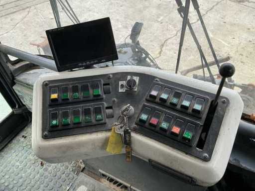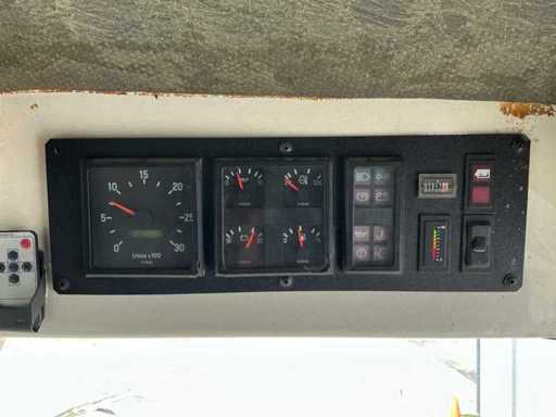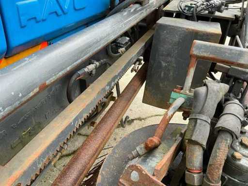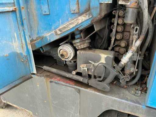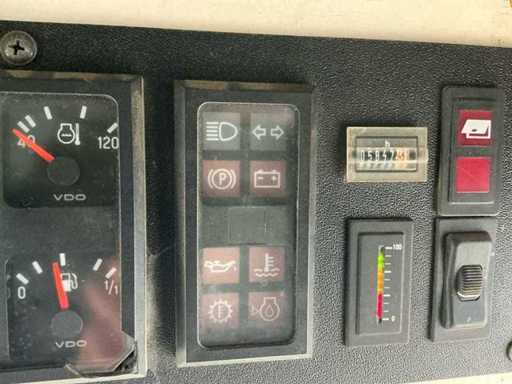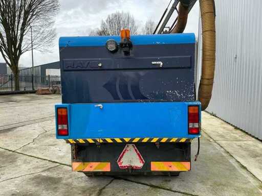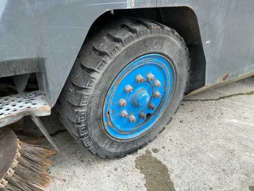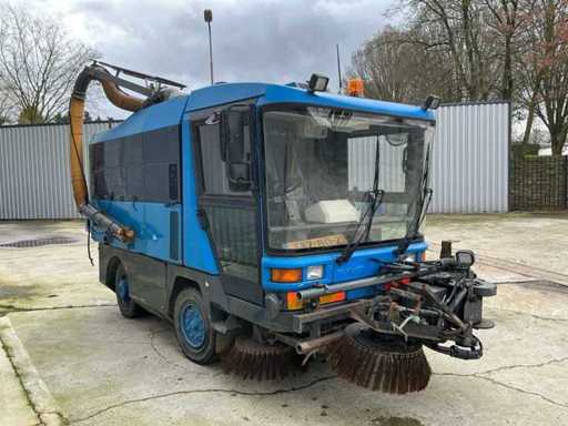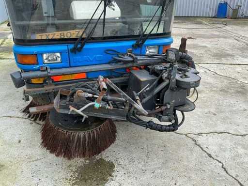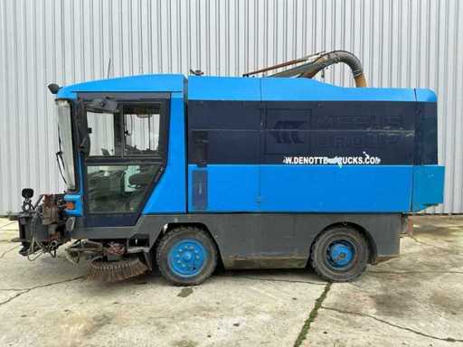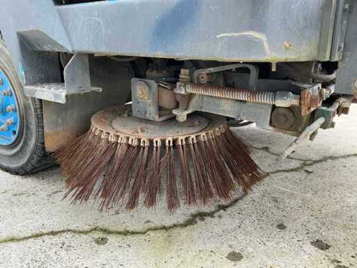 Equipped with: RAVO 5002, self-propelled compact street sweeper, brand RAVO, type 5002, year of construction 2000, equipped with hydraulically tiltable dirt container and closed cabin, suitable for use on industrial estates, logistics centers and municipal cleaning, time reading: 5,847 hours (read), 6-cylinder Iveco diesel, power: 81 kW, speed: 700 – 2500 rpm, empty weight: approx. 5,560 kg, max. Total weight: 10,500 kg, hopper capacity (waste container): 5.0 m³, Water tank: 600 litres, Standard working width: 2,200 – 2,400 mm, Working width with 3rd brush: up to 3,300 mm, Registration number: present, VIN: present on type plate, steel brushes (adjustable), 3rd brush (adjustable), suction arm, front brush unit, hydraulically tipping waste container (5.0 m³), water tank (600 L), built-in high-pressure cleaner with reel and spray lance, TFT colour monitor in cabin, closed cabin with control console, radio, passenger seat, tow bar, lighting.