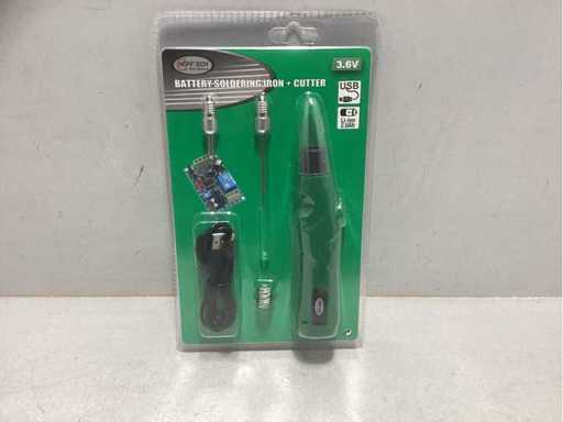 RECHARGEABLE BATTERY SOLDERING IRON / CUTTER 3.6 VOLTS Battery soldering iron / cutter rechargeable 3.6 volts. Rechargeable battery soldering pen, to be used for soldering, pyrography, styrofoam cutting etc etc.... Battery: 3.6 volts 2000 mAh. Heat soldering iron: 430°C. Heat cutting point 5mm: 300°C.
