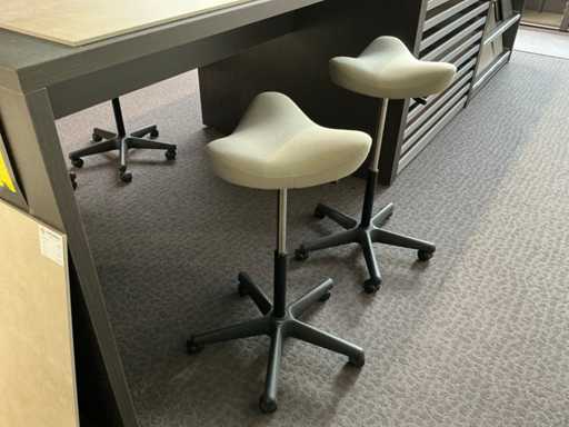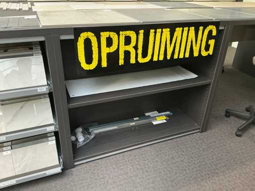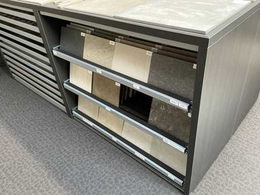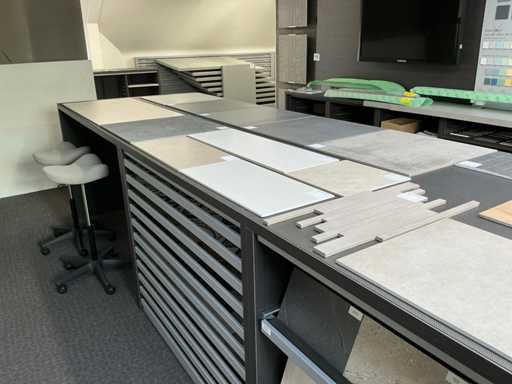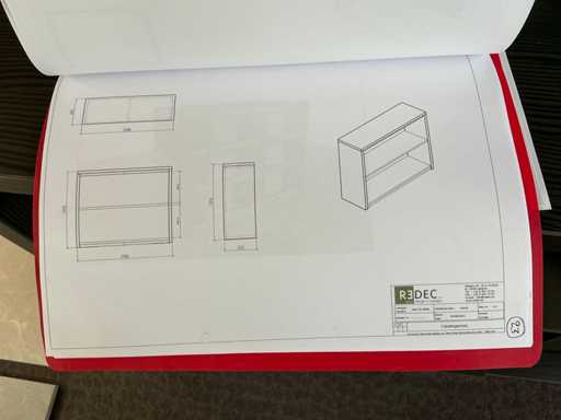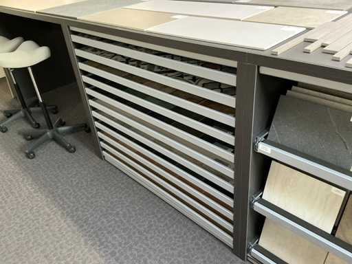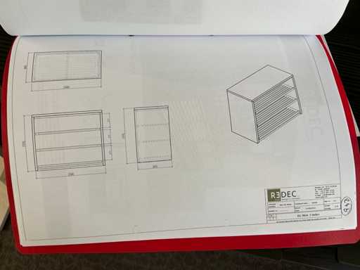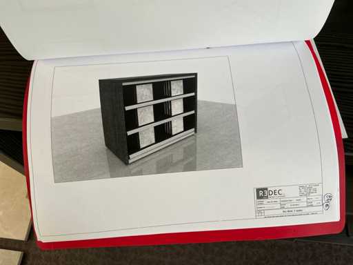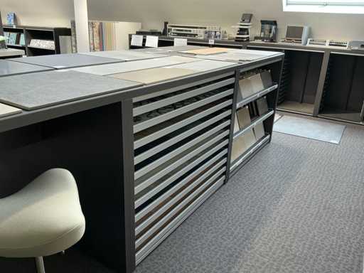 Consisting of table, equipped with 4x stools, with dimensions approx. 180 x 132 x 110cm, 2x REDEC BU Block 3 drawers, with dimensions approx. 133 x 66 x 110cm, 1x REDEC Catalogenniche, with dimensions approx. 133 x 44 x 110cm and 1x REDEC Delta 12/121, with dimensions approx. 132 x 88 x 110cm.