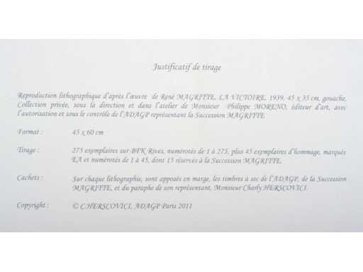 lithograph after the work of René Magritte 'La victoire' from 1939 - Provided with the ADAGP drying stamp and the Magritte Succession as well as the initials of Charly Herscovice - This is the largest published format of the series after Magritte