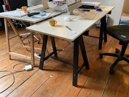 2 writing desks consisting of veneer top 150 x 80cm and 4 various wooden trestles, without any contents,