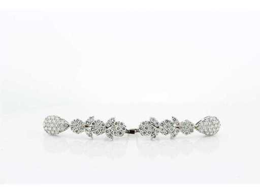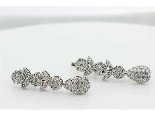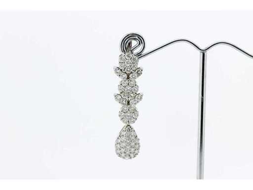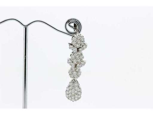 New and unworn. 14 karat white gold hanging earrings set with 106 brilliant cut diamonds weighing 4.30 crt. Colour G and quality VS. Length 40 mm. Includes an earring box and an appraisal report with an insurance value of € 11500,-- issued by a qualified appraiser. Gemstone: Natural diamond