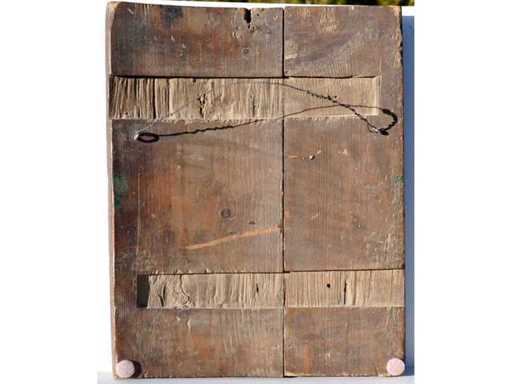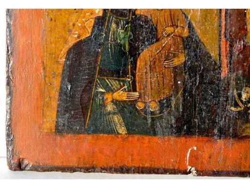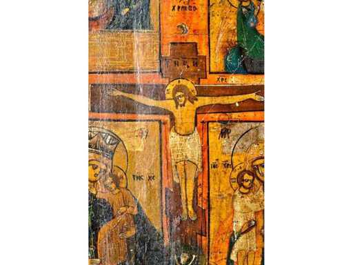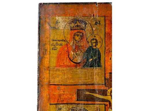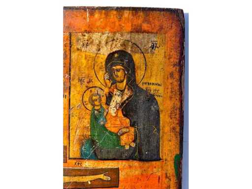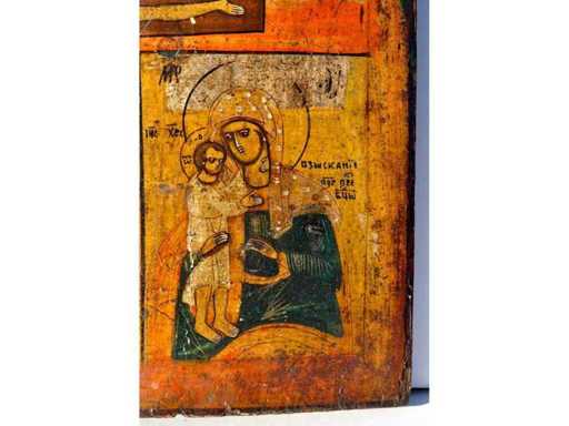 Multiple Russian icon consisting of five panels. In the centre is the Crucifixion of Christ, surrounded by four representations of the Mother of God with Church Slavonic titles. Made in tempera on wooden panel with gold accents. Traditional Orthodox iconography, late 19th – early 20th century.