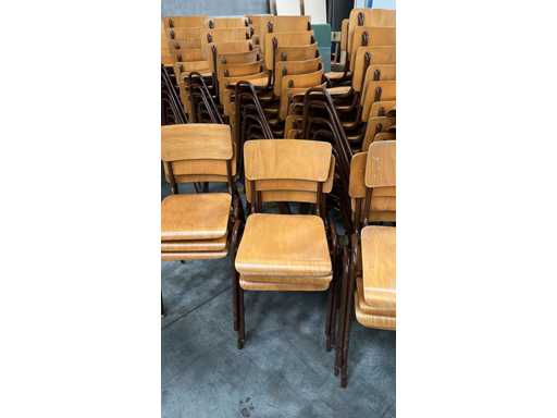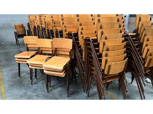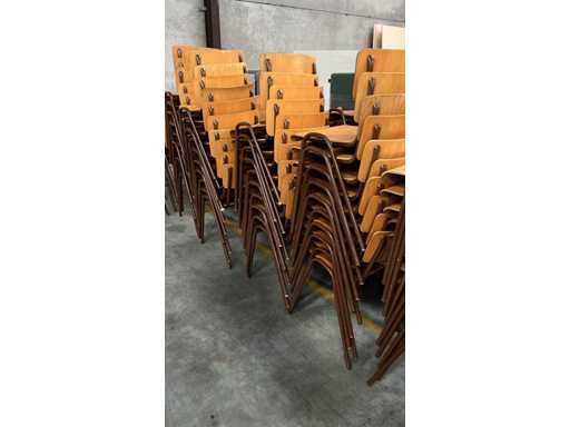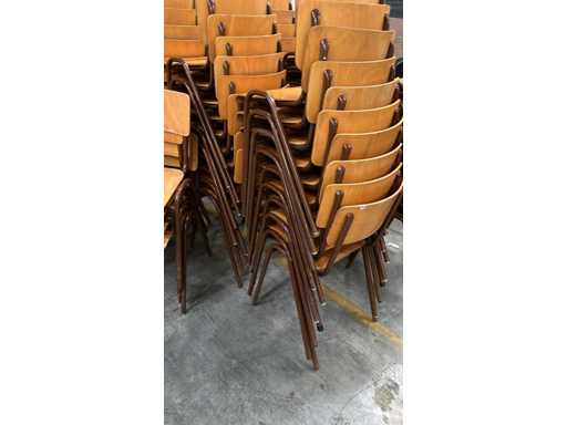 A set of 38 stables wooden school chairs with brown metal legs. With signs of wear and saturation on certain surfaces. Condition may vary