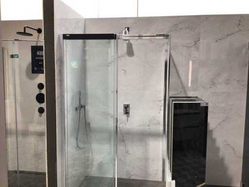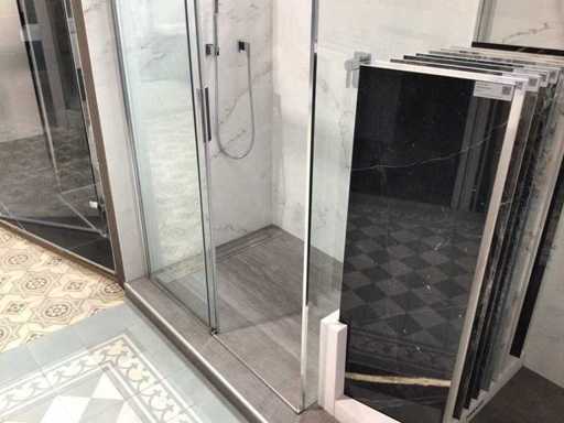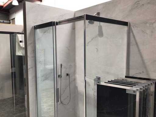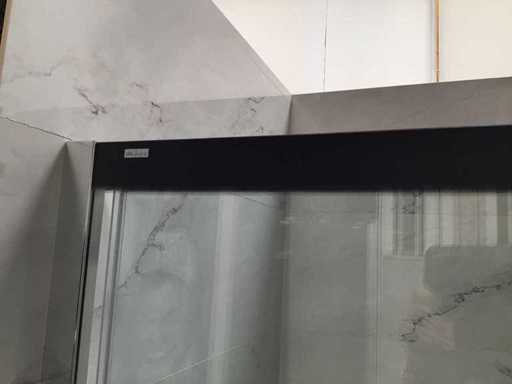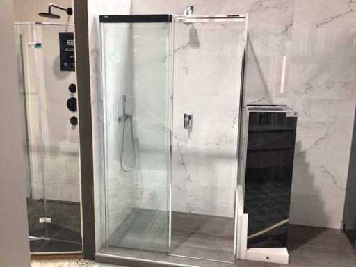 Show model sliding door 119x200 cm with side wall 86x200 cm. 8 mm Clear glass and silver high gloss profile. Sliding door is equipped with a soft close system.