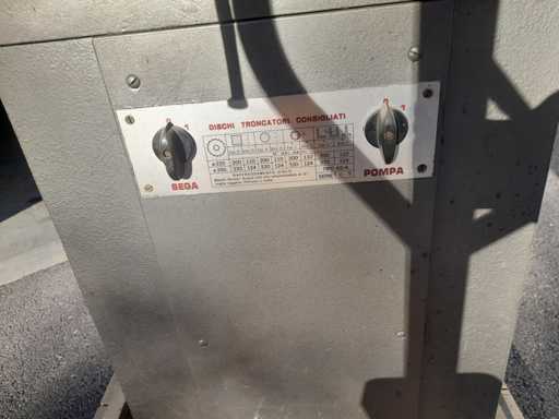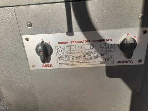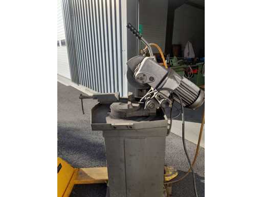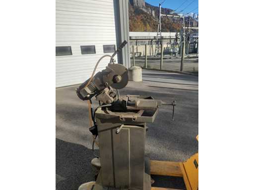 Cast iron frame mounted hacksaw with swivelling vise and integrated cooling.