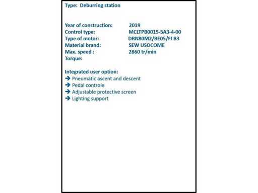 Industrial Deburring Stations – Year 2019 SEW USOCOME engine – Pneumatic control – 15 units available - General Description: We offer for sale 15 industrial deburring stations in good condition, year of construction 2019, designed for deburring operations in industrial environments. Robust, compact and safe stations, ideal for mechanical, machining, sheet metal or industrial subcontractors. - Technical characteristics Equipment Type: Deburring Station Year: 2019 Engine : SEW USOCOME Engine type: DRN80M2/BE05/FI B3 Maximum speed: 2860 rpm Order Type: MCLTPB0015-5A3-4-00 Structure: Column station with reinforced base - Integrated equipment Pneumatic up/down Foot pedal control Adjustable protective screen Built-in light stand Complete electrical box with dimmer and protections - Benefits Recent Material (2019) Rugged industrial manufacturing Engine recognized for its reliability Quick and easy installation Ideal for series or small series production Possibility of homogenizing a workshop with 15 identical workstations