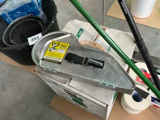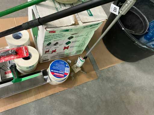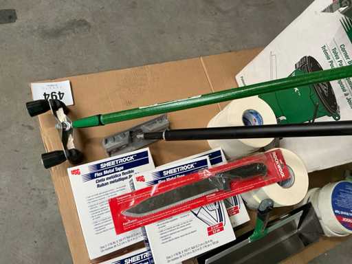 Includes rolls of drywall tape, dispenser for rolls of drywall tape, mixer, spatula, drywall saw