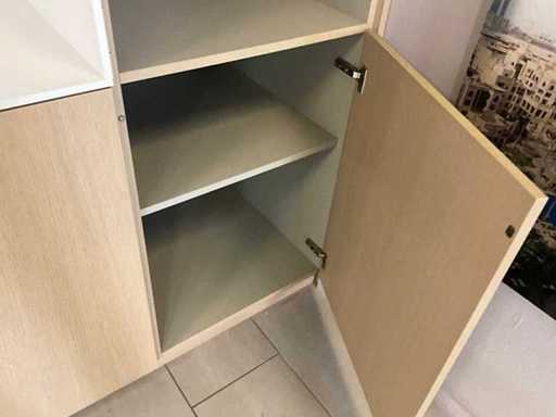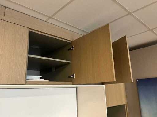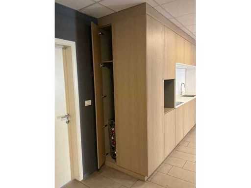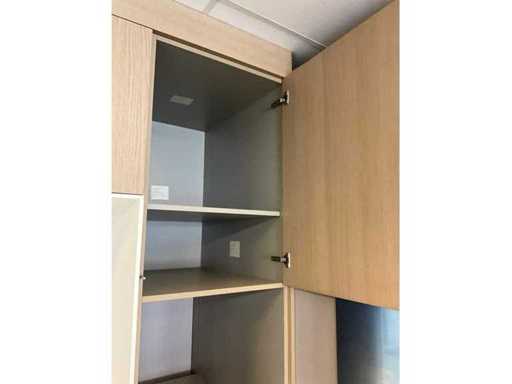with 15 doors, 1 along the side, 2 open storage compartments for appliances