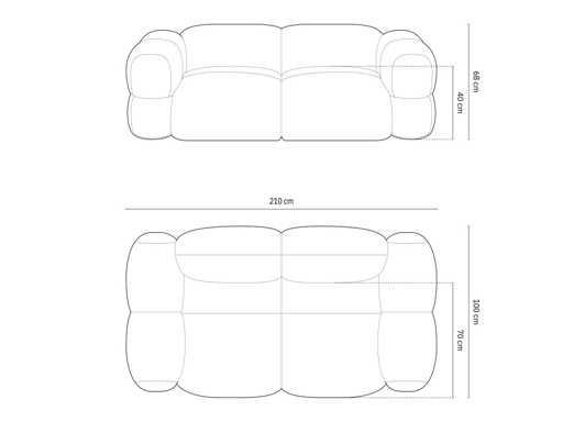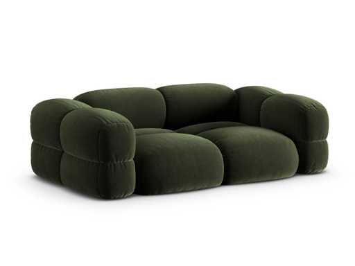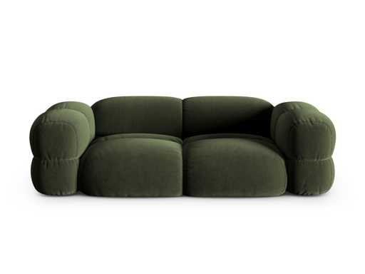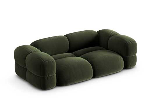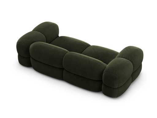 3-seater sofa. Velvet-touch polyester upholstery. Solid pine frame, furniture panels, fibreboard and plywood. Plastic feet. Upholstered and padded seat, backrest and armrests. Abrasion and peel resistant. Certification: Oeko-Tex® Standard 100. Made in Europe. Colour: green and black Dimensions: 210 x H68 x D100 cm Seat height: 40 cm Material: Cover: polyester Padding: polyurethane foam and wadding Frame: solid pine, furniture panels, fibreboard and plywood Feet: plastic Suspensions: springs and elastic straps Seat density: 30 kg/m³ Backrest density: 25 kg/m³ Martindale Test: 105,000, 370 g/m² Weight: 70 kg Maximum weight supported: 350 kg