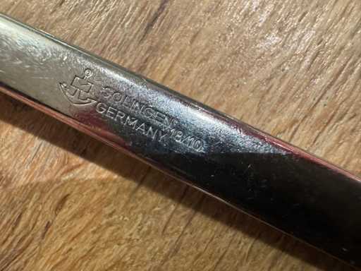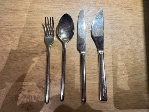 The set consists of = - 50x Solingen fork 21 cm - 50x Solingen knife 22 cm - 50x Solingen spoon 21 cm - 50x Picard & Wielputz pizza knife 23 cm Includes cutlery tray.