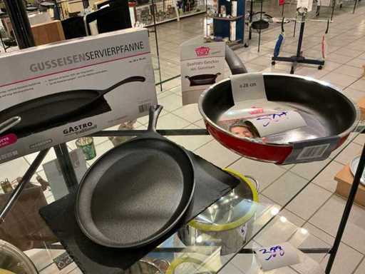 5 x roasting pan various sizes, 1 x sauté pan 28 cm with lid, 1 x cast iron roasting pan with trivet