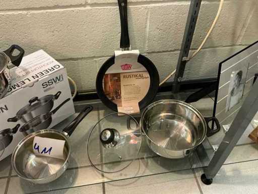 2 x cooking pot with lid in various sizes, 1 x saucepan, 1 x frying pan