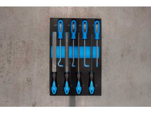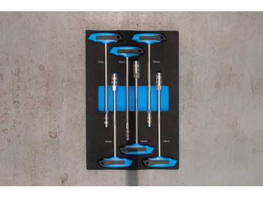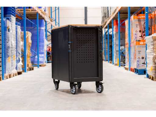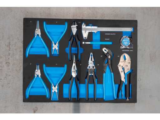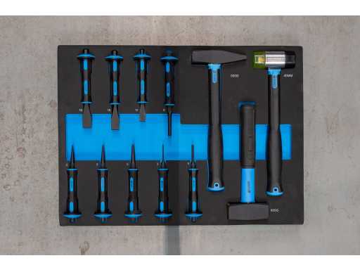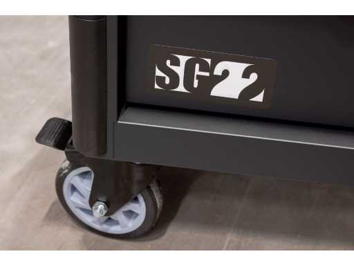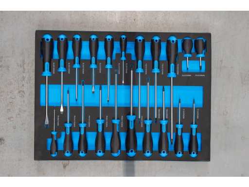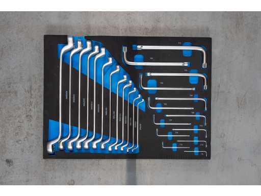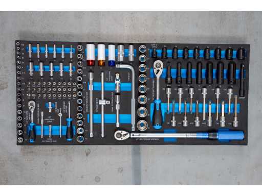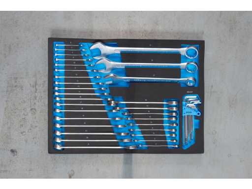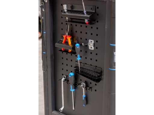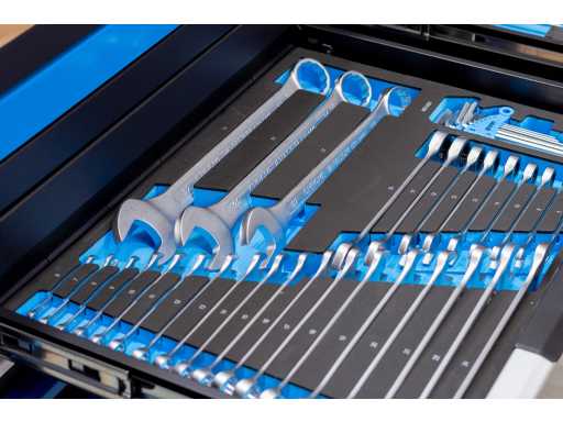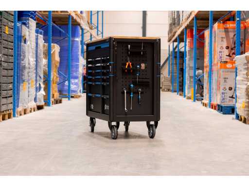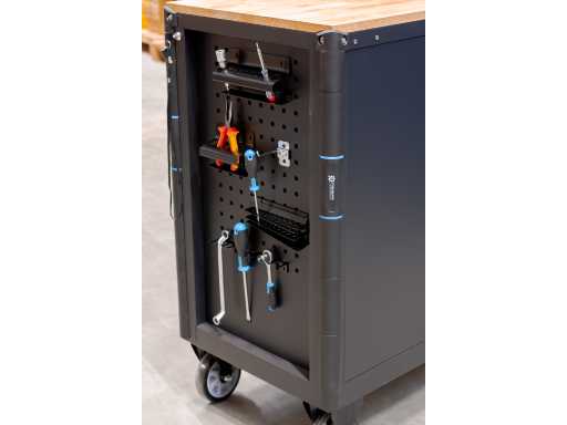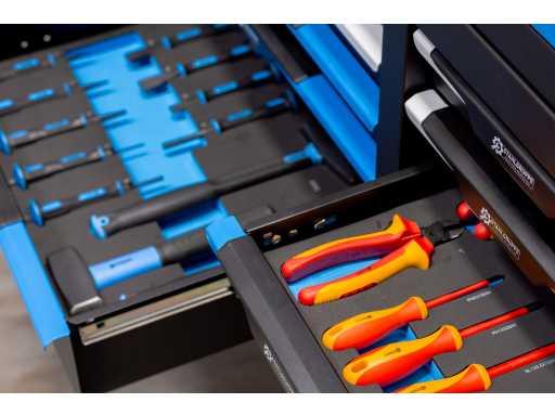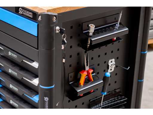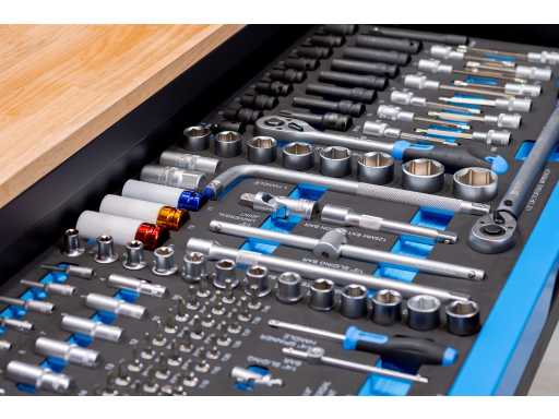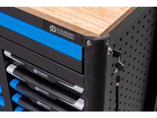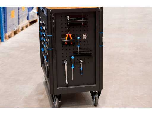 equipped with tools 294 pieces; 4 wheels, 2 of which have brakes; steering group; wooden worktop; 13 drawers; 11 drawers filled; 2 key sets; in the box; unused; 4145;