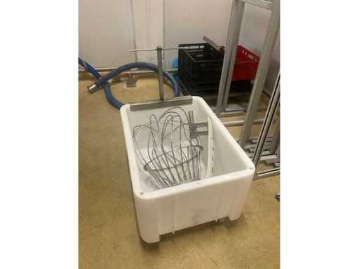 With a maximum diameter of 40 cm and height 70 cm, In PVC storage box with mobile base, stainless steel handle and lid.
