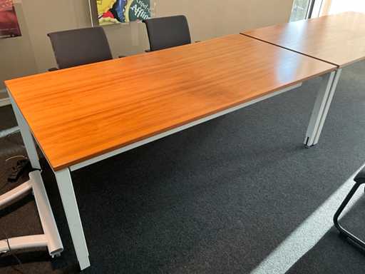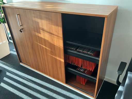 Includes 1x wooden sliding door cabinet 160x43x117cm, with metal shelves and file holders.