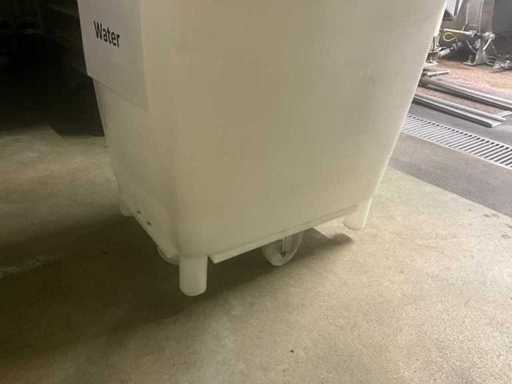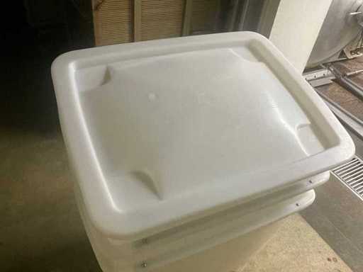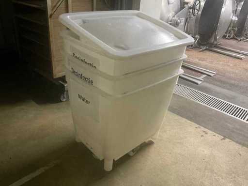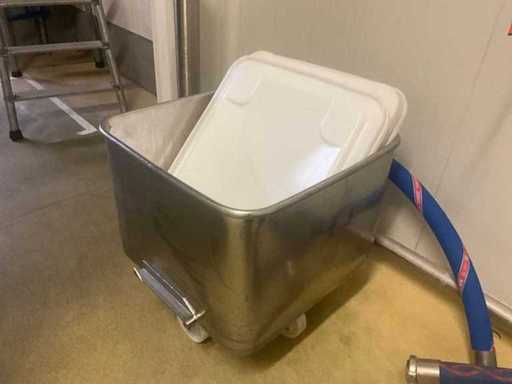Complete with some spare lids in stainless steel mobile box with 4 fixed wheels.