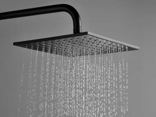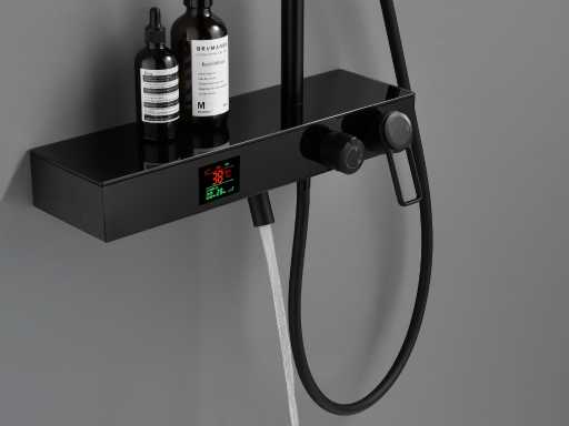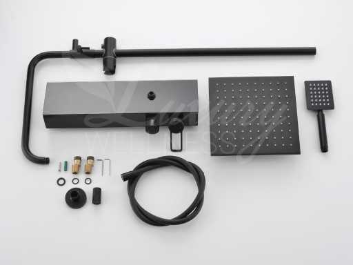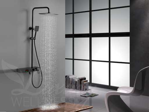 surface-mounted rain shower with digital display, Height adjustable 80-120cm, Material 304 stainless steel/brass, Color matte black, Faucet mixer tap, Ceramic interior, Shower head 25x25 cm diameter tilt/swivel with 2 functions, Hand shower adjustable, Equipped with digital micromotor control by means of water flow, no power required, temperature digitally readable, digital indication duration, ceramic interior good for 800,000 times open/close without leakage, operating temperature: 0 to 90 degrees Celsius, anti-lime treated, bath tap spout, tempered black glass shelf on top of control unit, Condition: New in box, Special features 2 year warranty, c.t.c. distance of 150 mm
