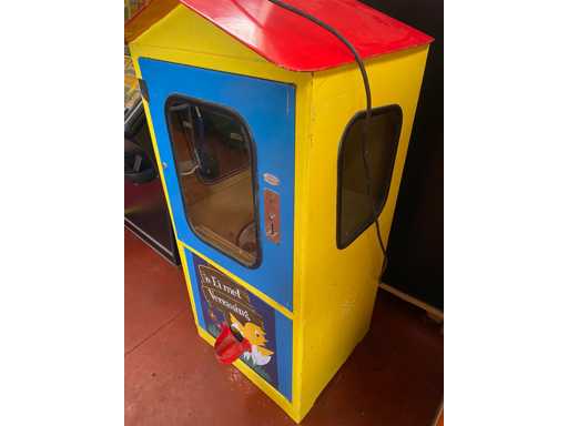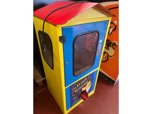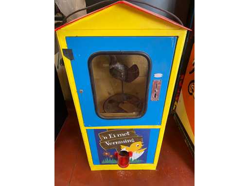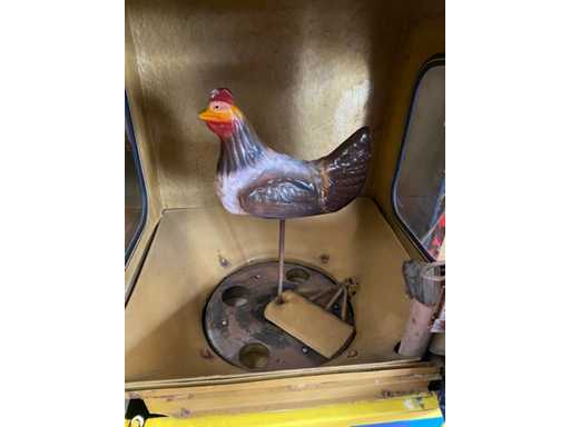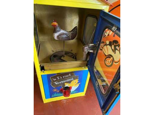 capsule vending machine with chicken giving capsule, vintage metal case, works on Dutch money