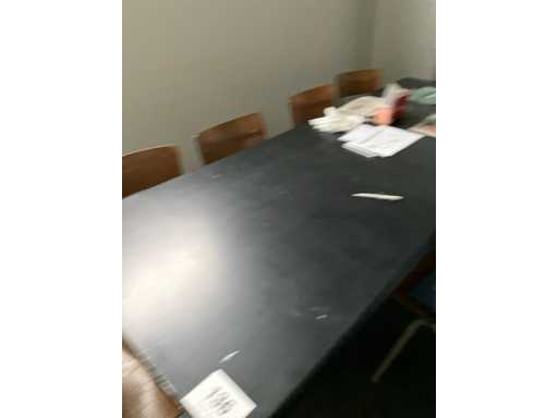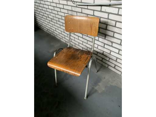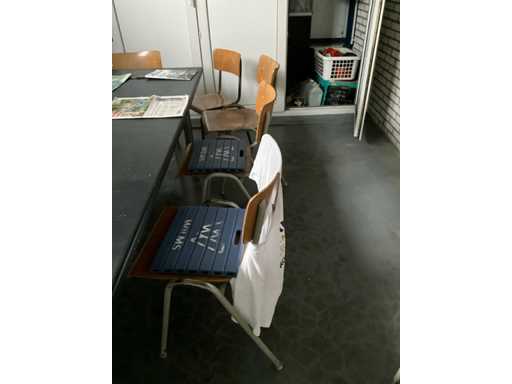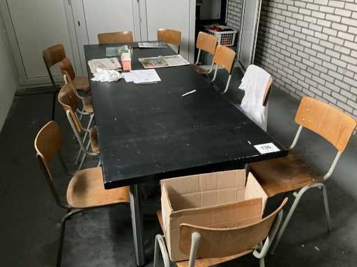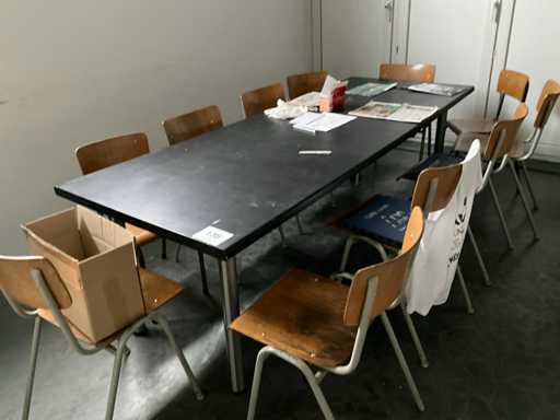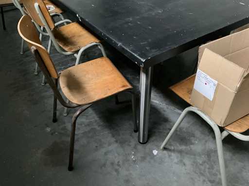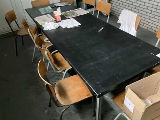 Canteen table with dimensions: 240x90x76cm + 10 various chairs with wooden seat and metal base