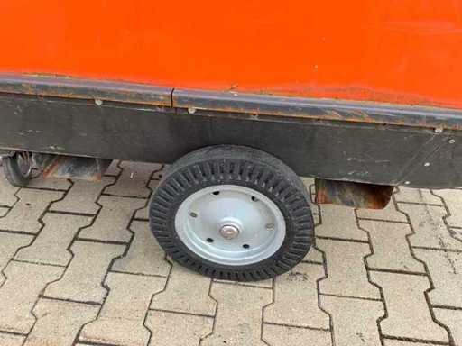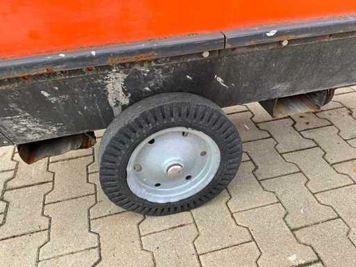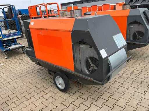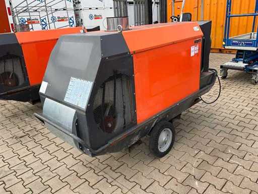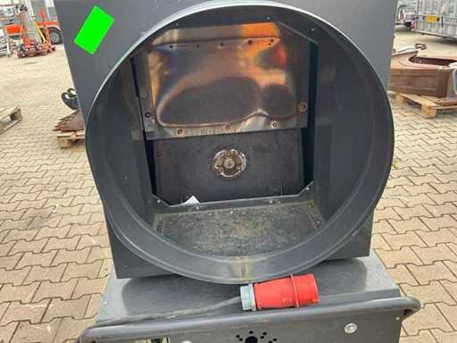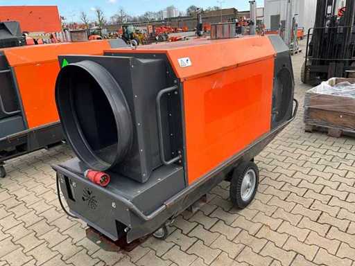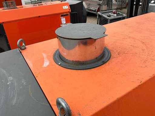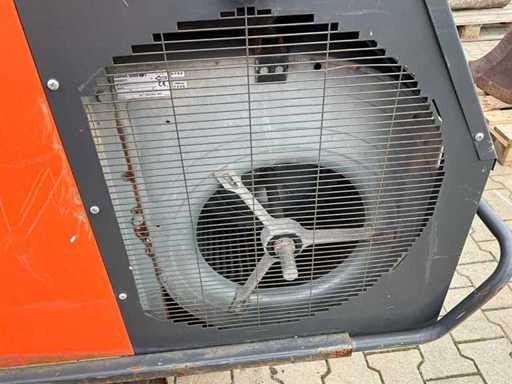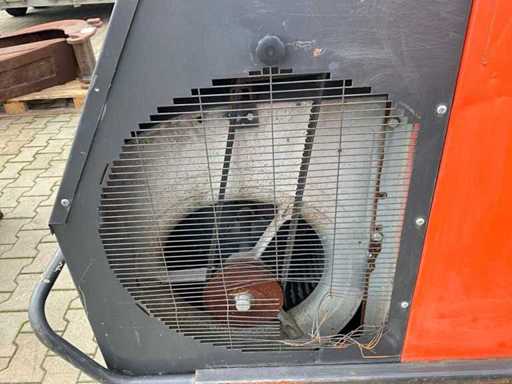 mobile; indirectly fired; diesel fired; external fuel connection; volume flow 11500 m3/hour; 7.7 Amps; air outlet diameter 600 mm; flue gas outlet; lifting eyes; forklift fork slots; working condition;
