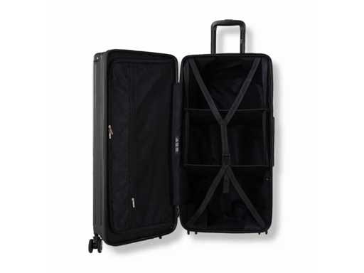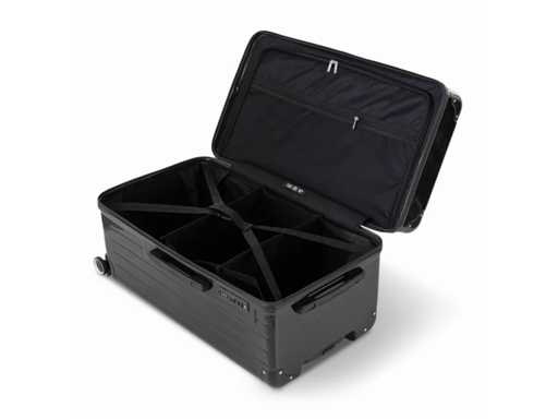 Interior fittings: Stacked drawer-style compartments + dividers and straps