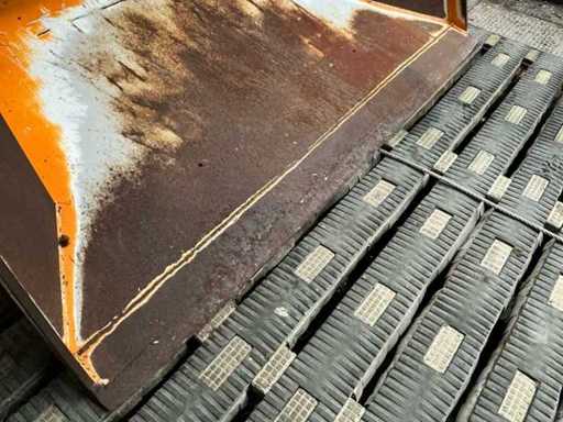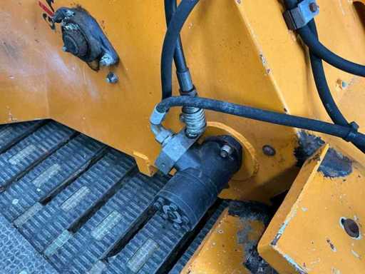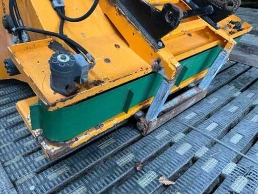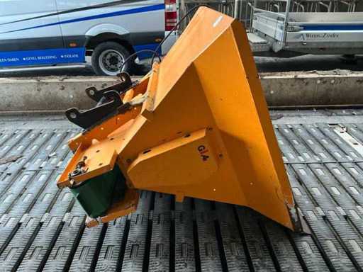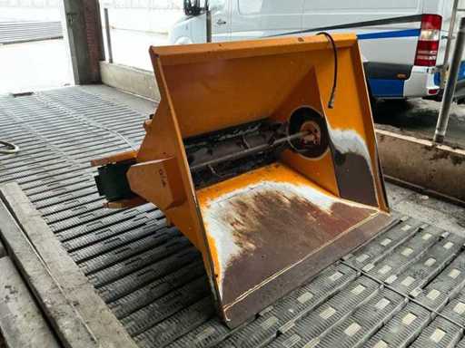 Equipped with: Giant spreader bucket, with Giant quick-change hooks, own weight: 420 kg, capacity: 1,440 litres, maximum working pressure: 180 bar, hydraulically driven dosing/driving gas, suitable for spreading sawdust, chopped straw, separated manure etc., hydraulically driven distribution roller at the bottom of the bucket with stirring reel, hydraulically driven unloading belt, unloading left and right, bin width: 1530 mm (total width), conveyor belt width: 1750 mm, total height: 1520 mm.