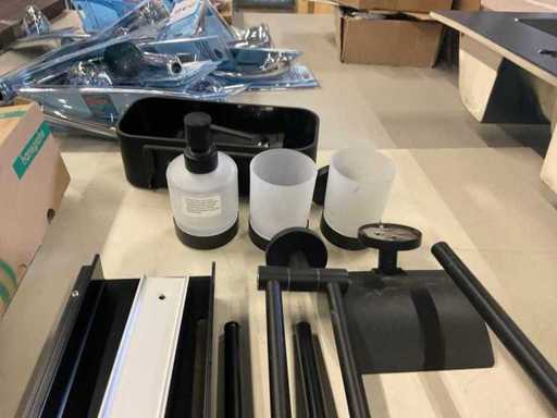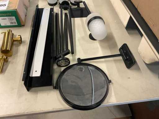 Shaving mirror; towel holders; toilet brush; toilet roll holder; 2 cups with wall holder; soap dispenser with wall holder; 2xShelf