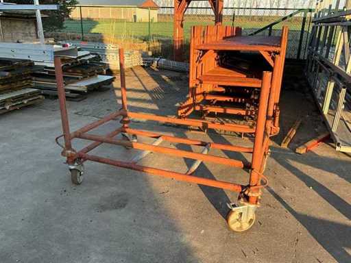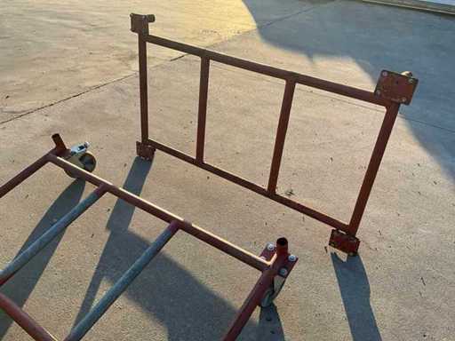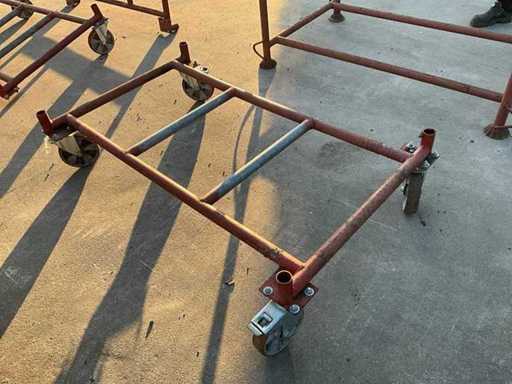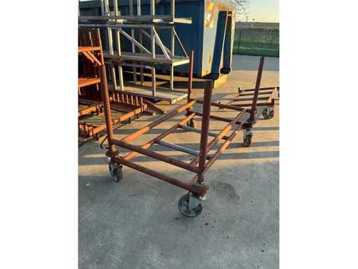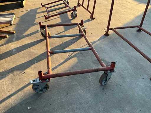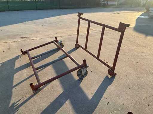 Trolley/chassis of approximately 163 x 94 cm, of which equipped with 4 support points on the corners, complete with ditto trestle of approximately 150 x 100 x 80 cm high serving to be placed on a base and 1 ditto trolley/chassis but only equipped with 2 wheels and again ditto chassis WITHOUT wheels.