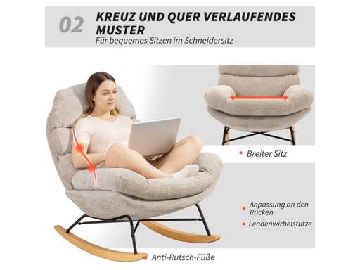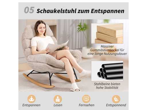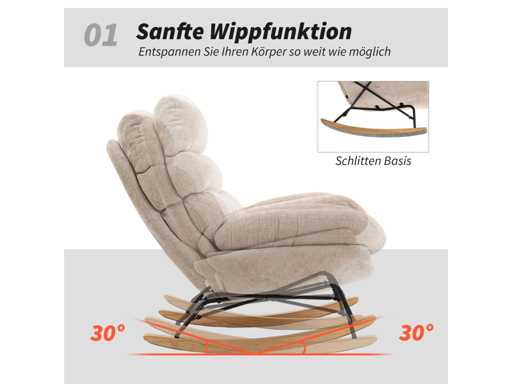 Upholstered rocking chair, steel legs and wooden glides, brown