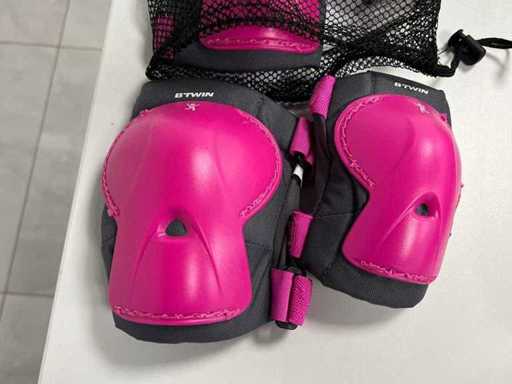Lot of sports protection for inline skating: knee pads, elbow pads and wrist/hand guards, plus helmet. Included are multiple sets/pieces as visible in the photos (black sets + pink child protection). Sizes/brand: see labels on photos. Condition: used, with normal signs of wear.