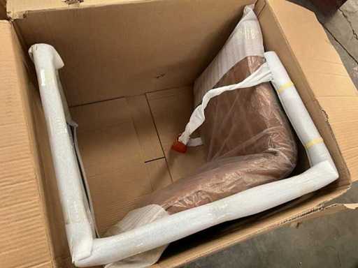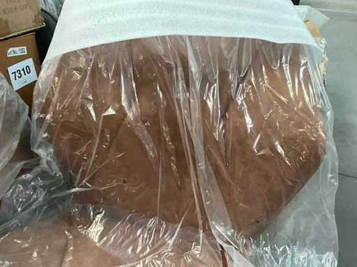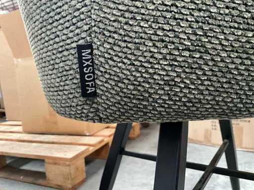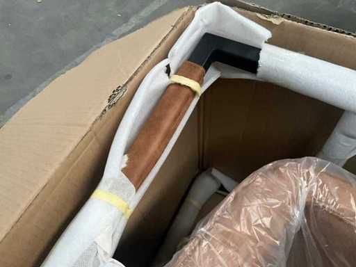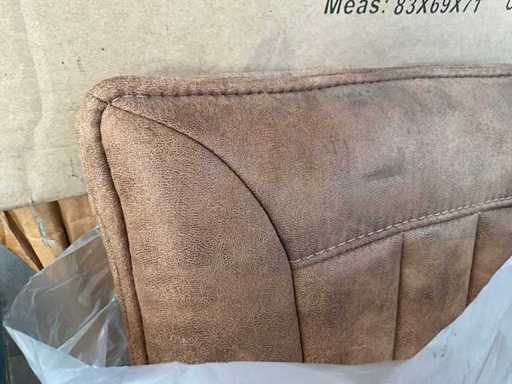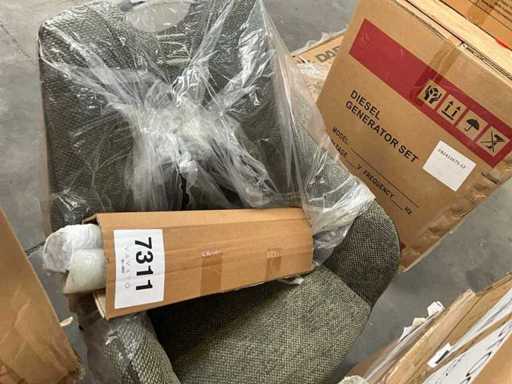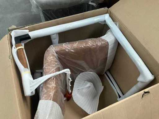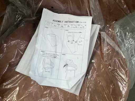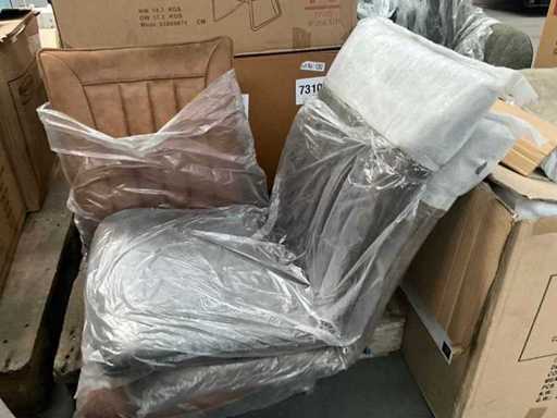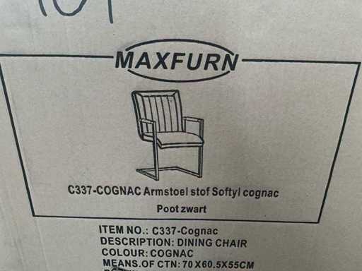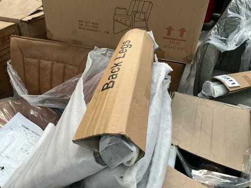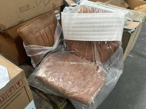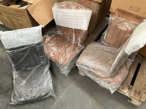 6 various seats, but only 3 metal bases present, 1 with 4 separate black metal legs. Screws for undercarriage may not be present. Of which 1x Maxfurn cognac armchair is complete, in box.