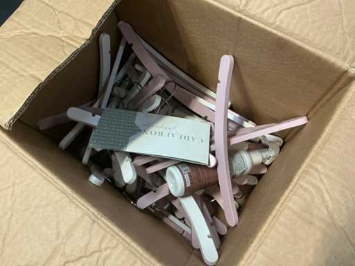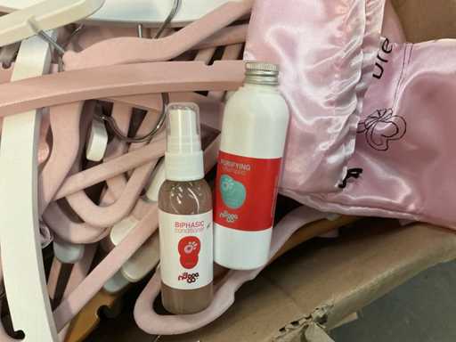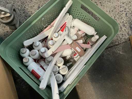 Including approx. 24 various conditioners and shampoos NOGGA, batch of various wooden coat racks HEMA and batch of various carrier bags, lying in 3 boxes and basket