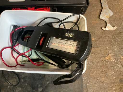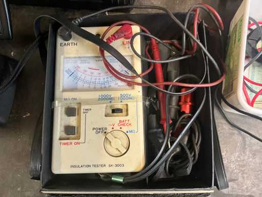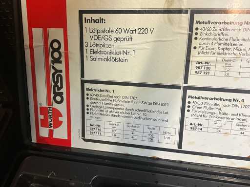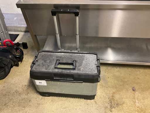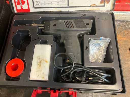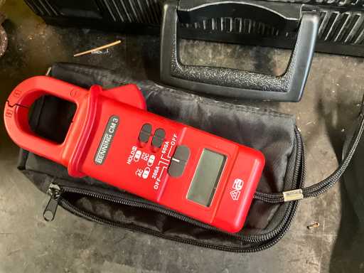 Various electronic tools including ELECTRONICAKETEN DETECTOR 110, welding gun WURTH ORSY 100, 2 various clamp meters including BENNING CM3, INSULATION TESTER SK 3003, lying in mobile tool case STANLEY, located in room 40