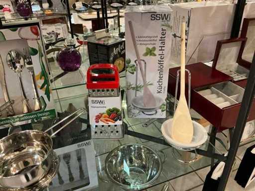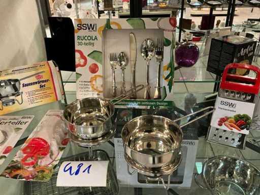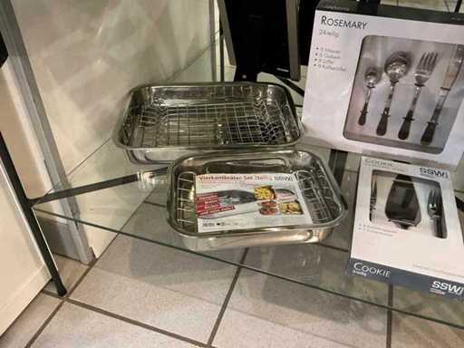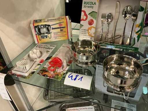 Including saucepans with warmer, 1 x cutlery 24 pieces, 1 x cutlery 30 pieces, 1 x garnier syringe, 1 x wooden spatula with spoon holder, 1 x egg slicer, 1 x grater, 2 x square stainless steel oven dish with grid, 1 x colander, 1 x 9 piece cake set for 8 people, 1 x spagetti spoon