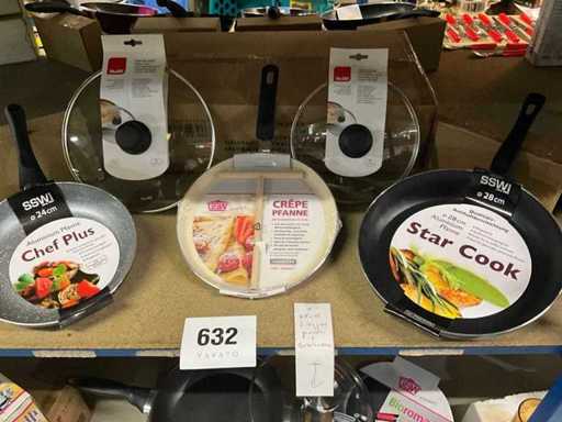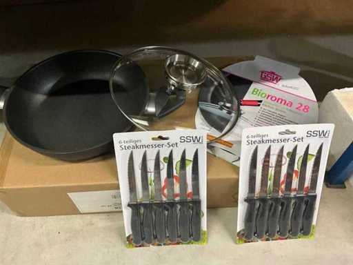 Including1 x roasting pan 28 cm with glass lid; 2 frying pans of different sizes, 1 x pancake pan with dough divider, 2 x 6 piece steak knife set, anti-splash lids, and so on...