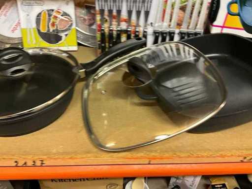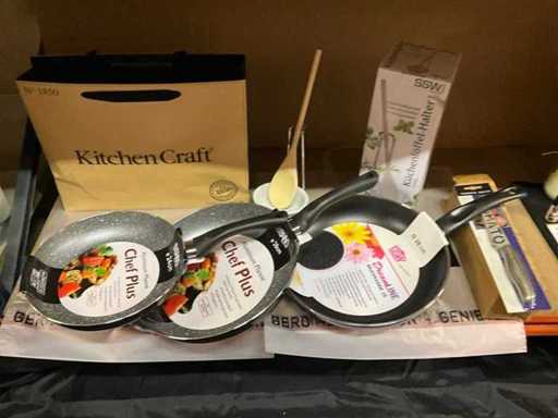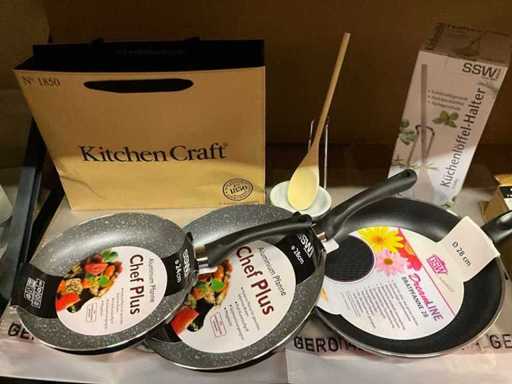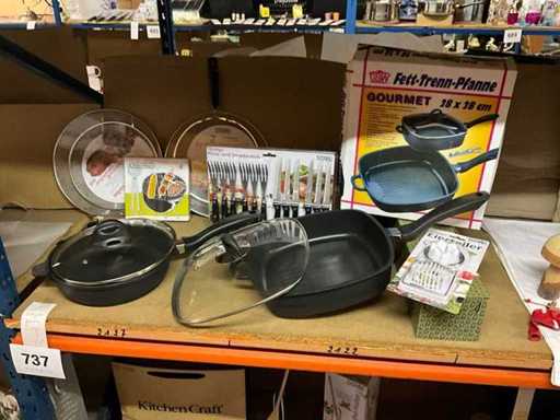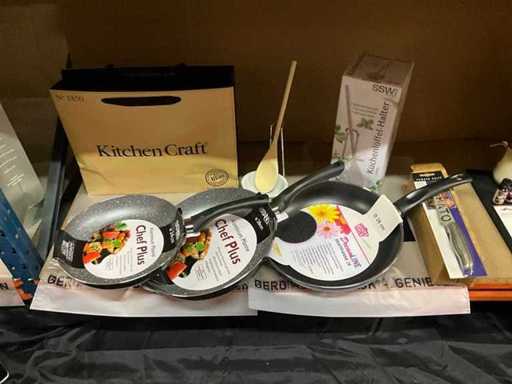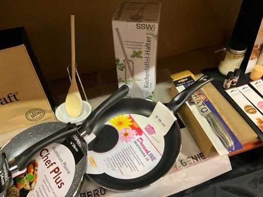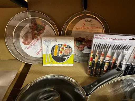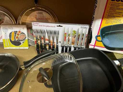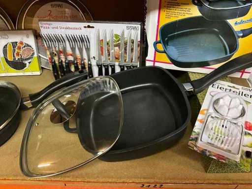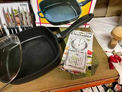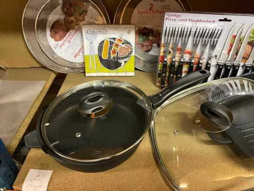 1 x gourmet pan 28cm x28cm with glass lid, 1 x gourmet sauté pan 24 cm with glass lid, 1 x egg slicer, 4 x anti-splash lid, 1 x 12 piece pizza/steak set, 3 x pan various sizes, 1 x stainless steel tomato knife, 1 x wooden spatula with holder...