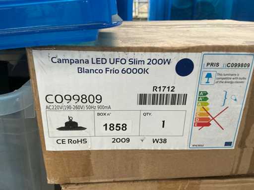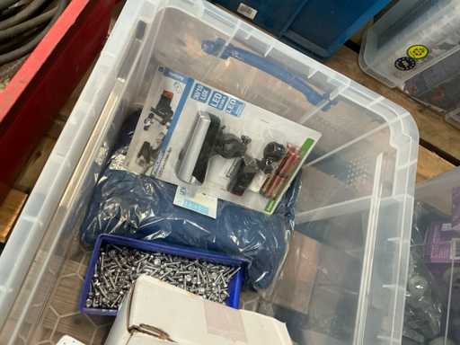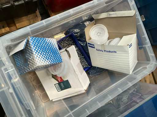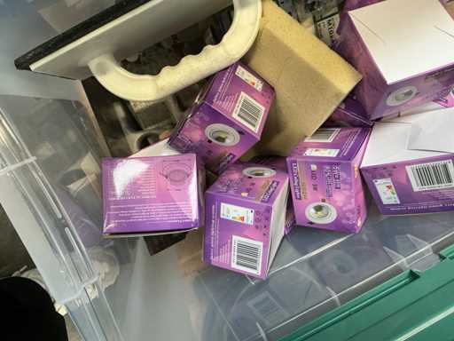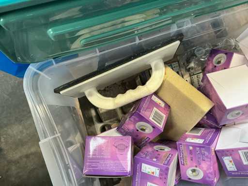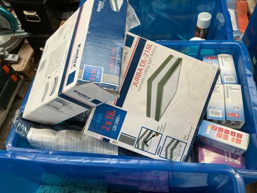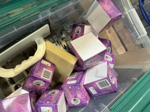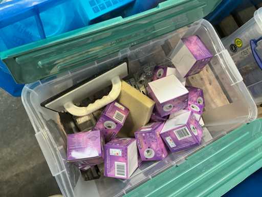 Including various spotlights, lamps, electric lot,.. lying in 5x storage bin and 2x cardboard box.