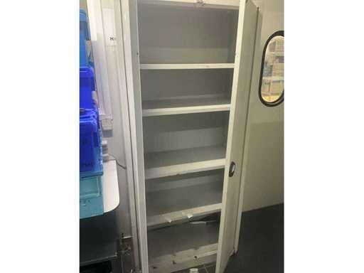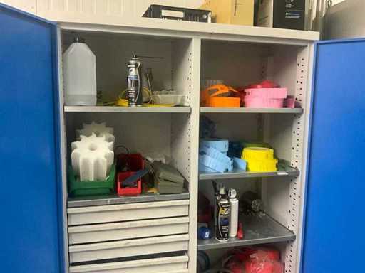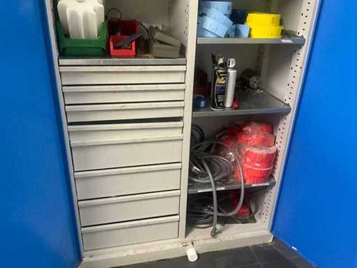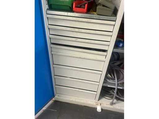 Including storage cabinet of approximately 120 x 50 x 195 cm high, with contents, being a lot of miscellaneous and built-in 8-slide drawer unit