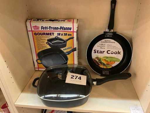 including square fett-trenn pan with glass lid, pans various sizes...