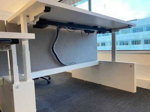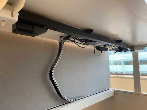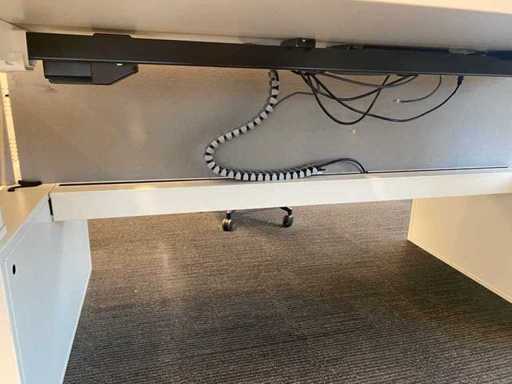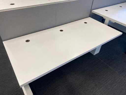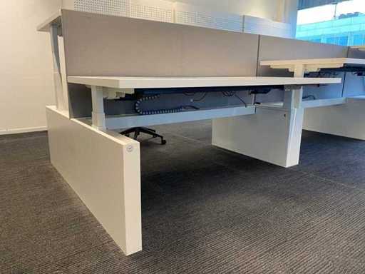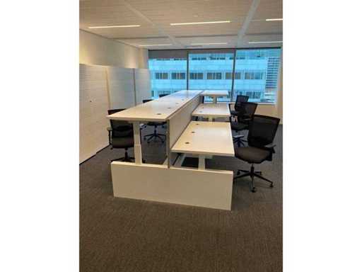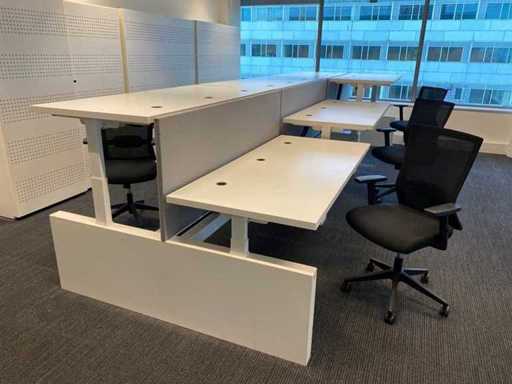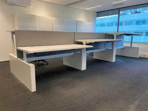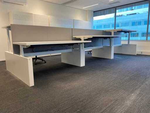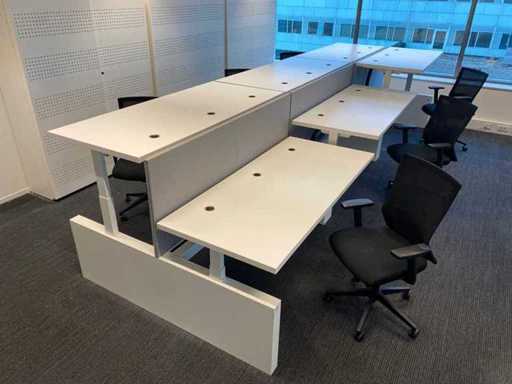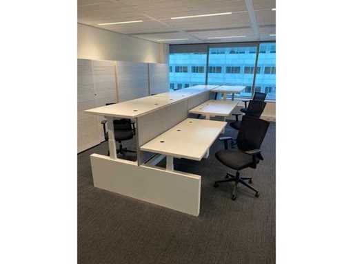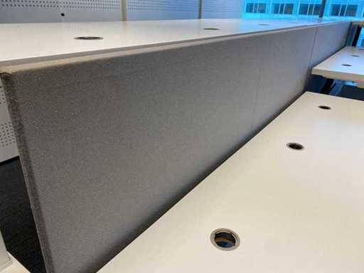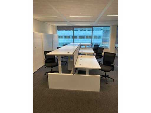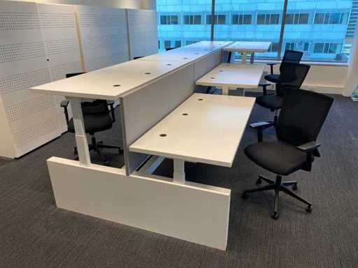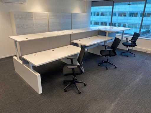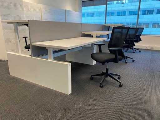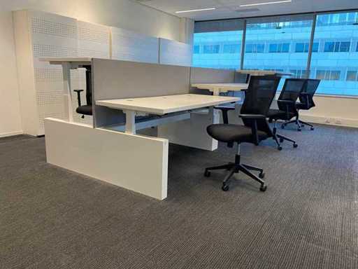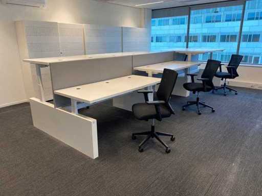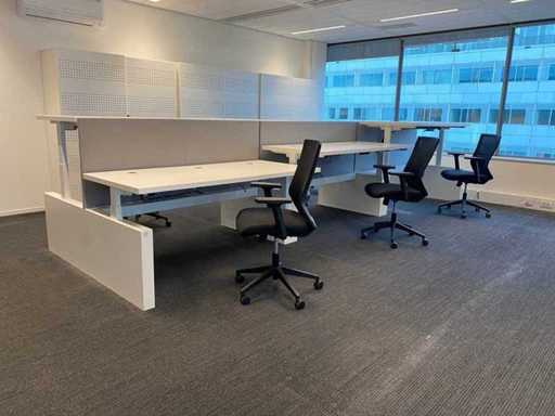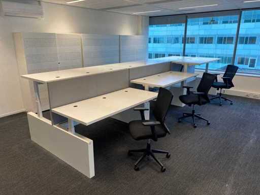 Lot consisting of 1x Vepa 6p workbench and 6x WeWork office chair. ----- Office chair with height-adjustable armrests, seat height adjustable, tilt mechanism backrest, netweave back upholstery. ----- Workbench with acoustic gray partitions, cable entry, wire tray. Total size workbench approx. height 65 to 131 cm. - Width 540 cm. - deep 168 cm. ----- Workbench has already been completely professionally disassembled and unpackaged. ----- top size per desk is approx. 180x80 cm.
