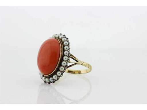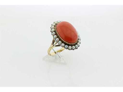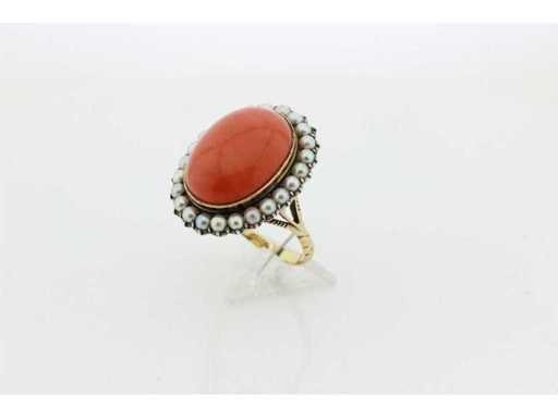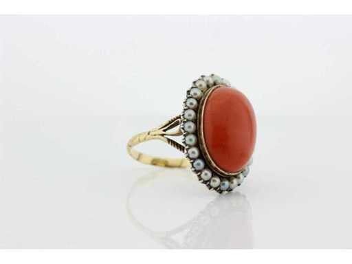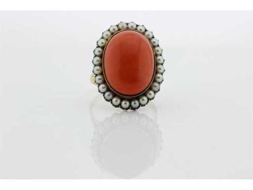 Antique 14 karat yellow gold rosette ring with an oval cabochon cut red coral with dimensions 20.5 x 16 mm set in 1st grade silver. Around 24 cultive saltwater pearls set with a diameter of 2.7 mm. Includes a ring box and a valuation report with an insurance value of € 2250,-- issued by a qualified appraiser. Gemstone: Red coral/cultive pearl