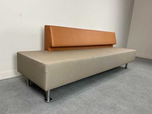 Definition Modern modular sofa with straight backrest, upholstered in two-tone artificial leather. The seat is in light gray, the backrest in copper/bronze color. The whole rests on sturdy round metal legs with flat base plates. Suitable for waiting areas, reception areas or catering establishments. Comfortable seat and sleek design, easy to maintain.
