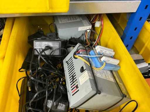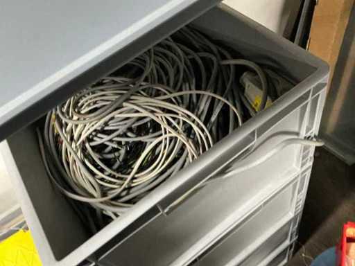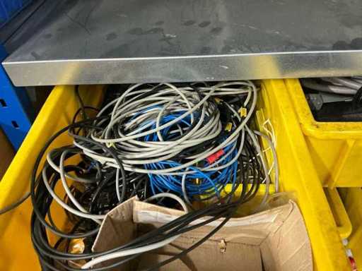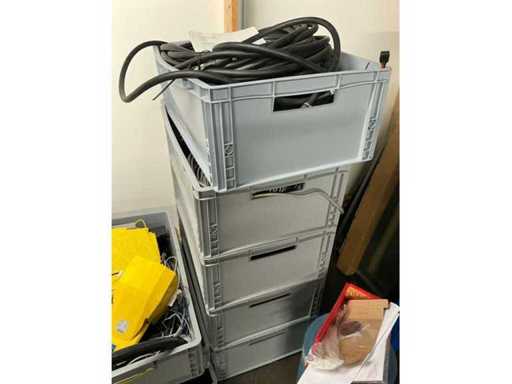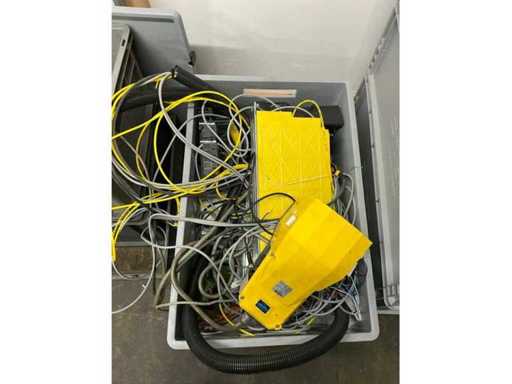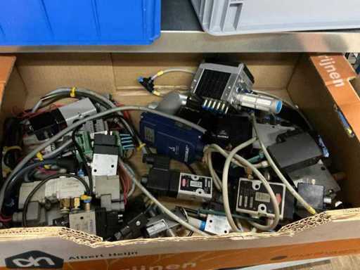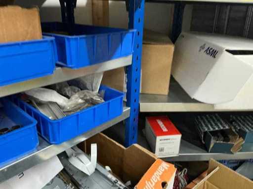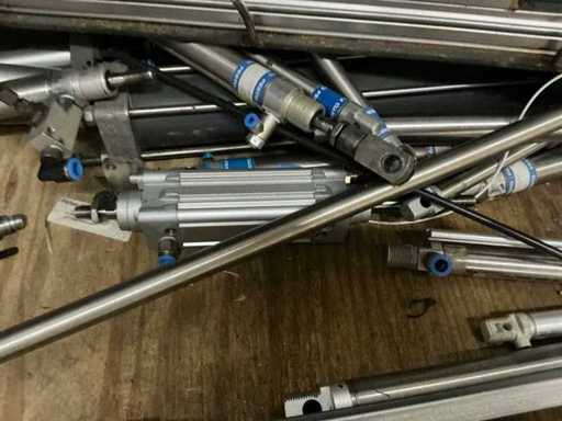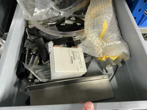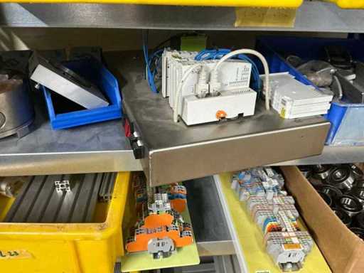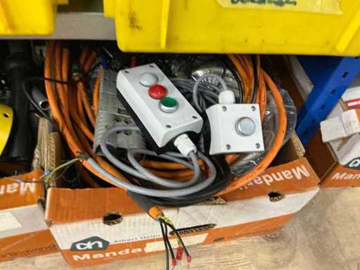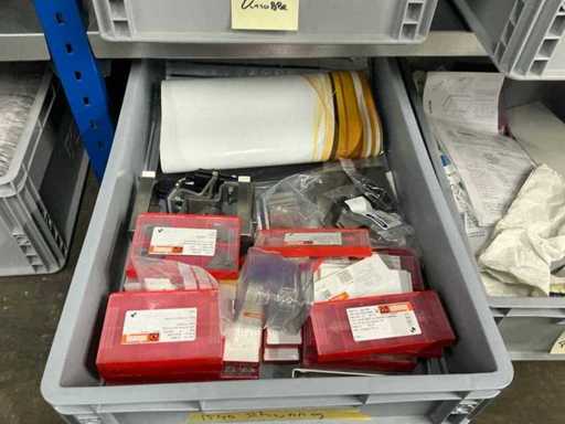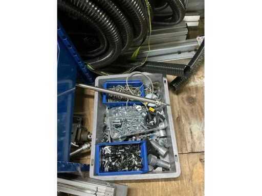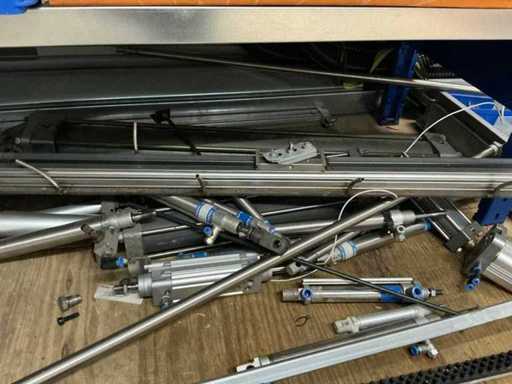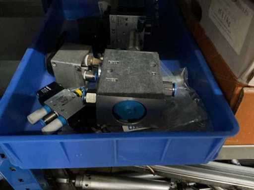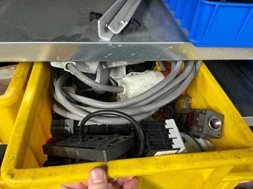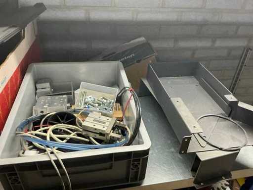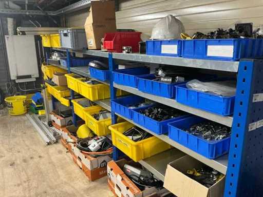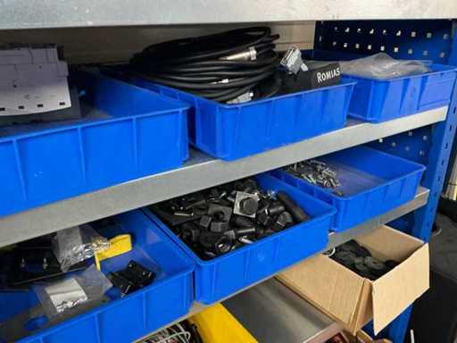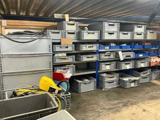 Various machine parts, cables, Festo cylinders, etc. The warehouse is located on a low platform with a narrow staircase. The buyer must leave the warehouse (without racks) empty.