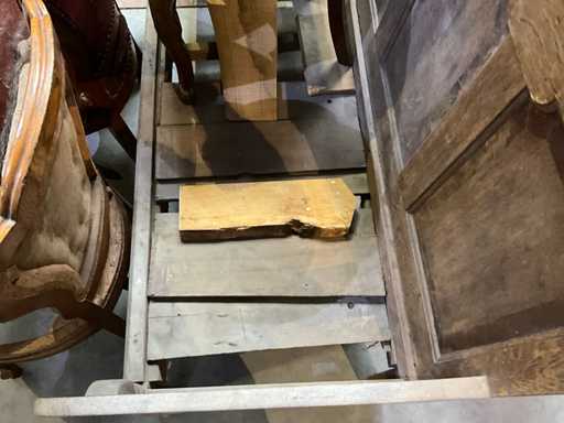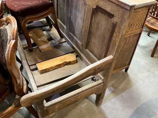 TO REPOSE!, consisting of wooden bench with backrest and armrests, seat to renew, +7x antique chair with fabric seat and backrest